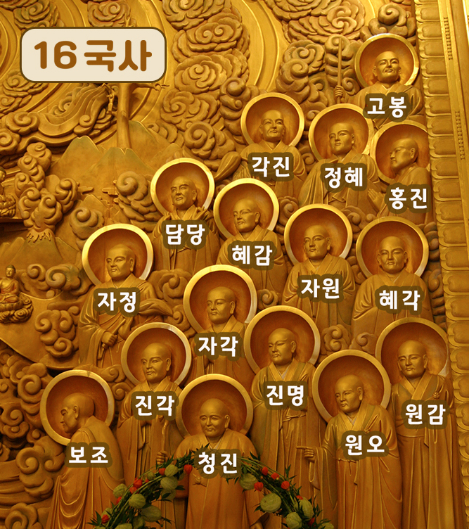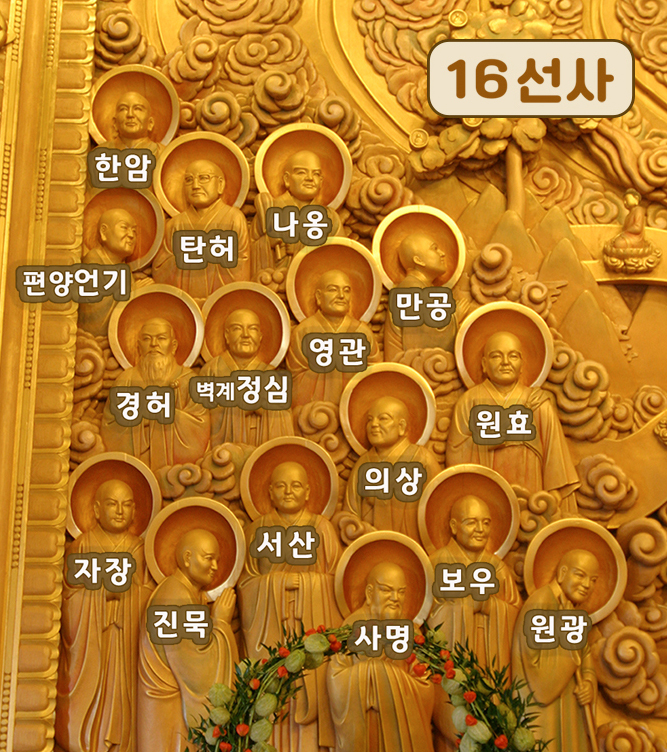석가모니 부처님 좌우로는 우리나라의 16선사와 16국사가 모셔져 있습니다.
