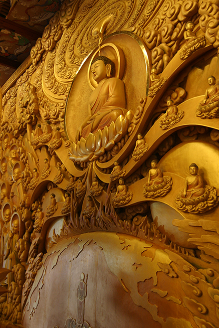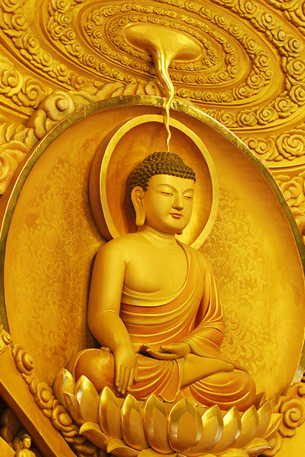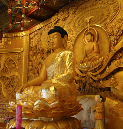 부처님께서 성도하시던 순간을 묘사한 중앙의 탱화를 살펴보면, 성도의 순간 법열 속에서 앉아 계시는 석가모니 부처님 정수리부분으로부터 나오는 커다란 에너지가 온 세계를 뒤덮어, 대지가 흔들리고, 화산이 터지고, 우주가 진동합니다.