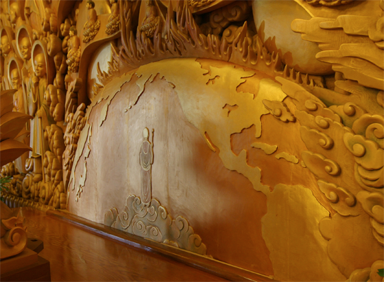목각 후불탱화는 세 부분으로 나뉘어져 있는데 중앙 부분에는 부처님께서 성도하실 때의 상황이 재현되어 있고, 좌측에는 지옥계,우측에는 중생계가 표현되어 있습니다.